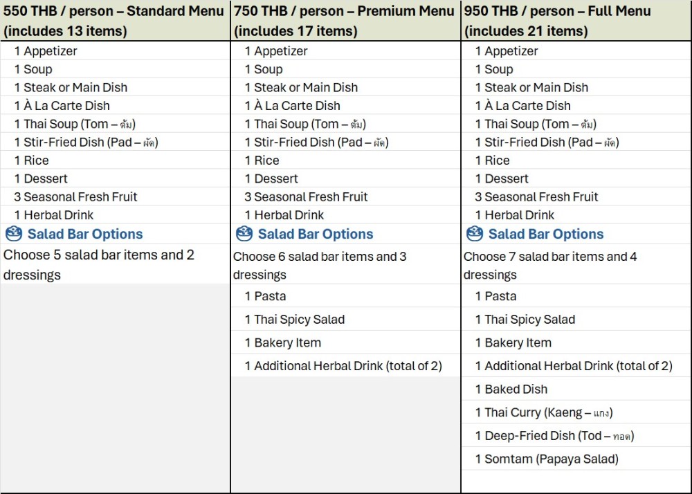 550 THB / person: Choose 5 salad bar items and 2 dressings | 750 THB / person: Choose 6 salad bar items and 3 dressings | 950 THB / person: Choose 7 salad bar items and 3 dressings