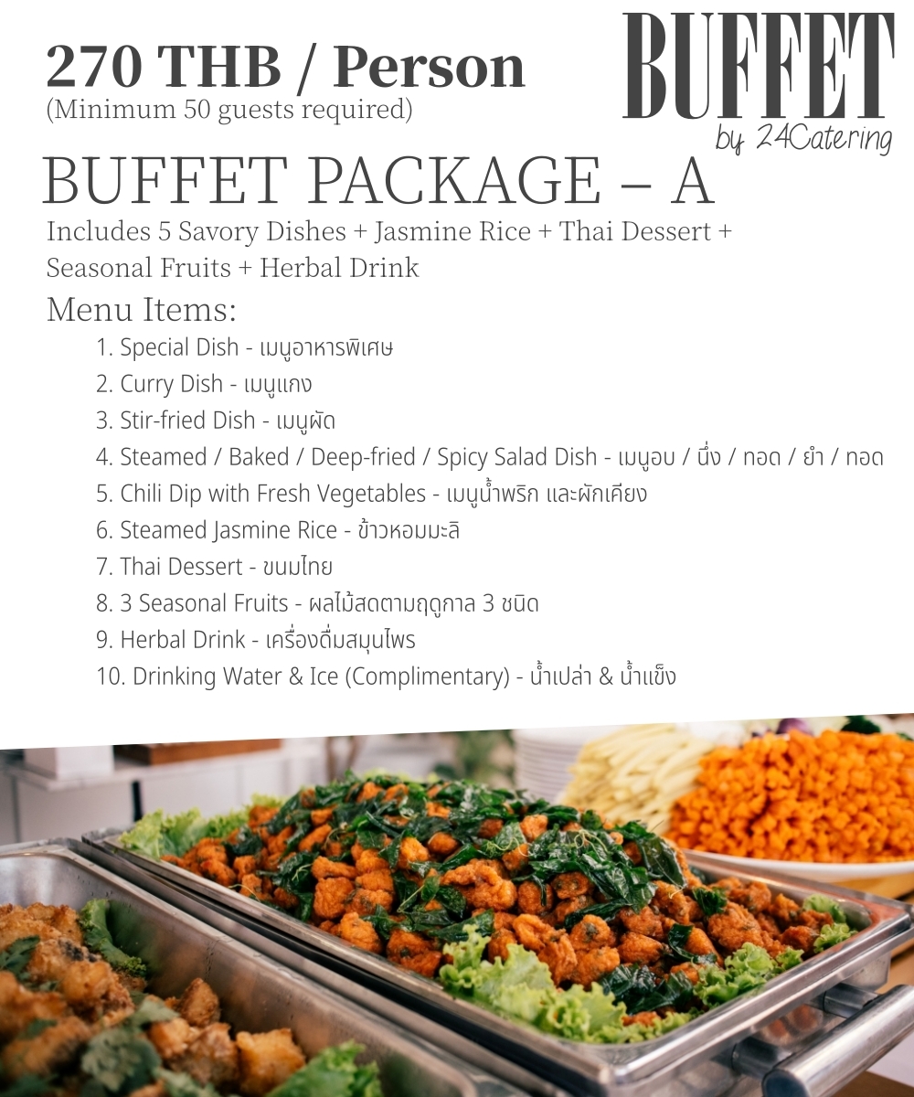 บุฟเฟ่ต์ไทยรสจัดจ้าน วัตถุดิบคุณภาพ รับจัดบุฟเฟ่ต์อาหารไทย (Thai Buffet) และ อาหารนานาชาติ(Inter Buffet) รสชาติ จัดจ้าน มีทั้งรูปแบบ ต้ม ยำ ทำแกง และสาระพัดผัด กับน้ำพริกที่เสริฟมาคู่กับผักสด ต่างๆ ได้รับความนิยมตลอดกาล ด้วยรสชาติ อาหารที่ถูกปากคนไทย มีเมนูอาหารบุฟเฟ่ต์ ให้เลือกหลากหลาย